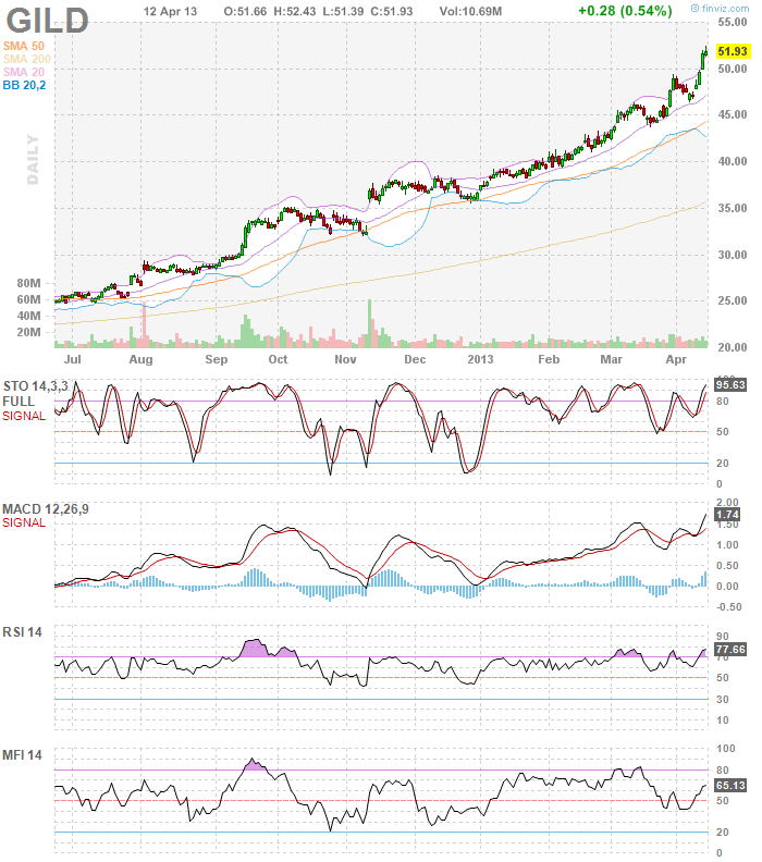 - i have a full position in $GILD, cost @ 44.12. $GILD closed today @ 51.65. i have no immediate plans to add to $GILD or trim it. sticking to my thesis this stock and other top biotechs will be market leaders for at least the next 9 – 12 mons. i will re-consider adding to or trimming $GILD after it reports earning later this month on about apr-24-2013.