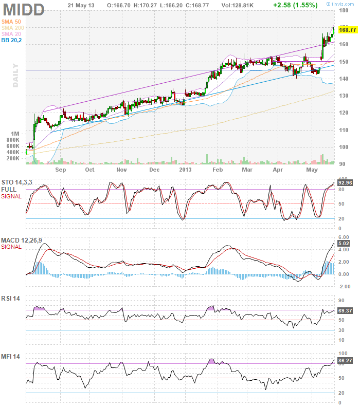 - MIDD has been one of my fav industrial stocks this year. currently listed as no. 1 leader in it’s category on IBD. the daily & weekly chart show MIDD has recently broken out. in the weekly timeframe, this is the second week of gaining higher since since breaking out of the box. MIDD looks to continue it’s charge higher.