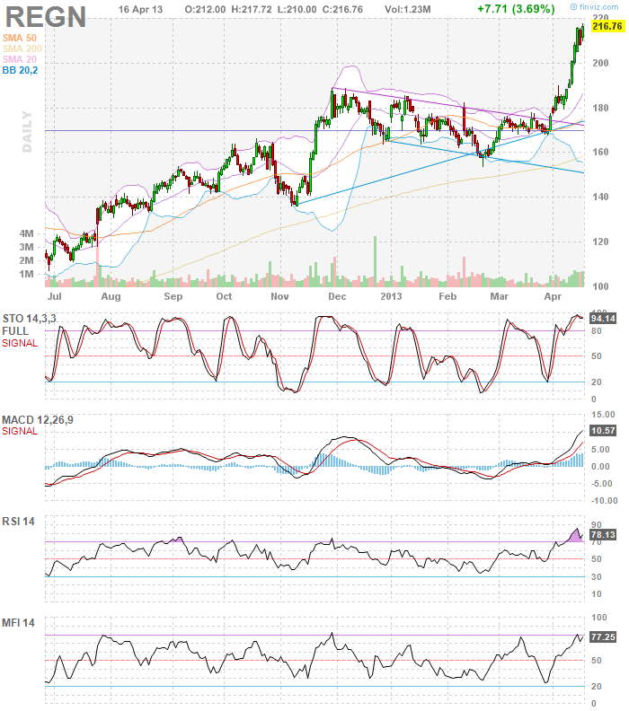 - REGN is a powerful quick momentum stock. by the time it breaks out, it’s almost too late to catch that leg higher. i recently mentioned this stock on apr-10-13. a bearish shooting star candlestick formation developed and i was suspicious of a possible breakout. i put candlestick formation ahead of other technicals i pointed out, stayed out and missed this rally. i suppose worse things have happened. next time i encounter a similar chart pattern, i will be more considerate of ALL the parameters and not let one outweigh all the others.